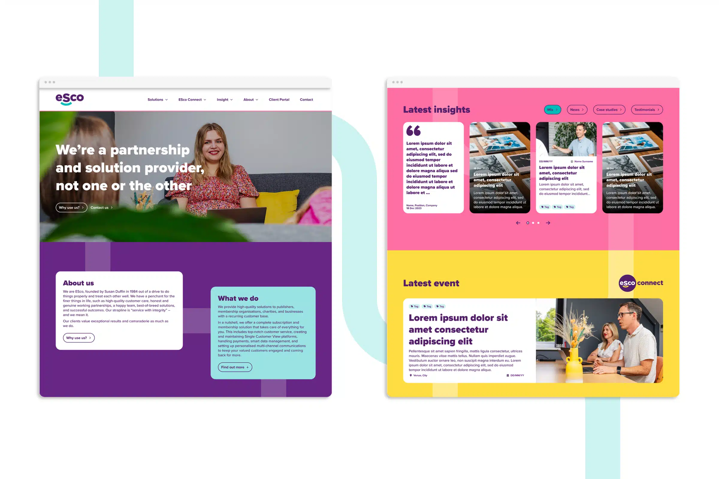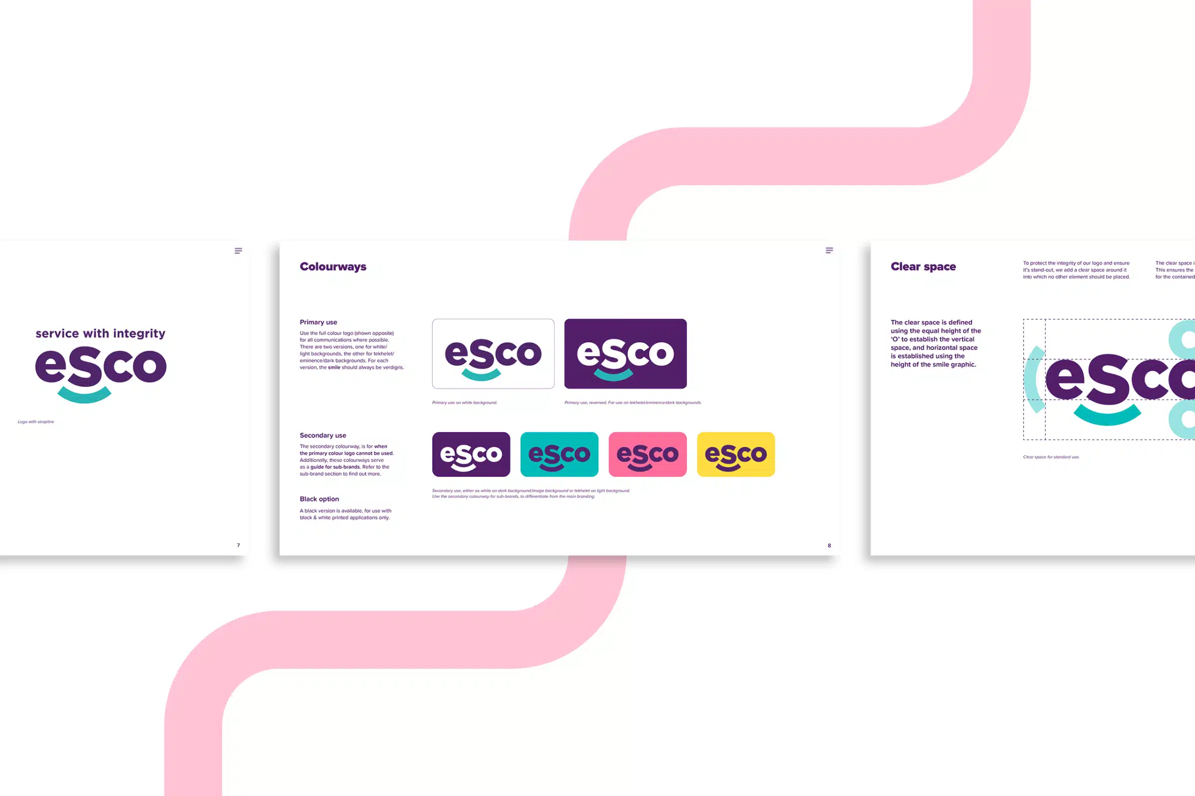 We provided a refreshed visual identity with a sleek, modern logo and updated colour palette. The ambitious brand design system uses geometric shapes derived from the logo’s smile. The shapes foster a sense of connection across ESco’s branded content. This, coupled with a vibrant colour palette and candid photography, helps to convey the authenticity of a brand that values its people and culture.