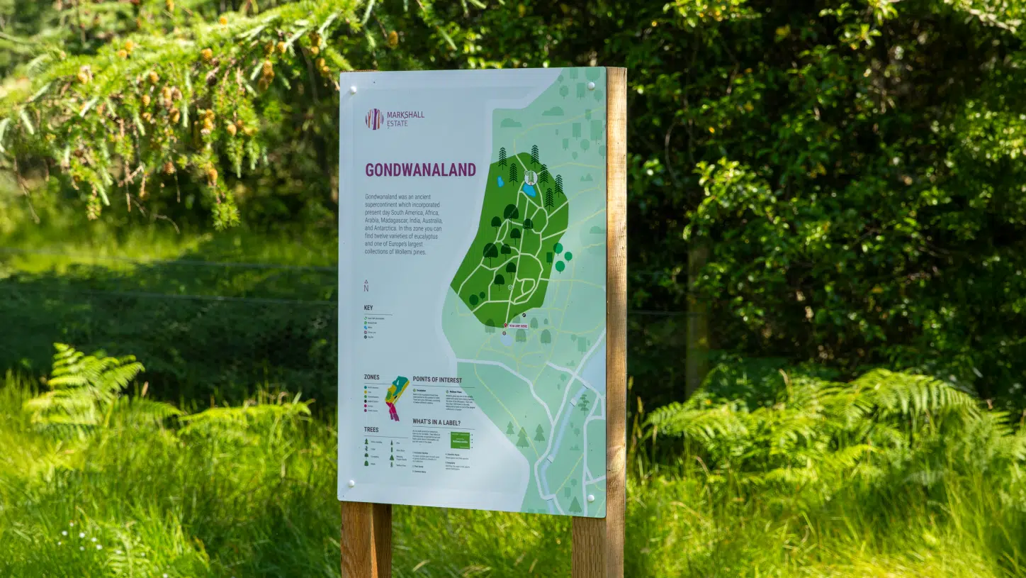 Once the map was finalised, we created a set of signs, catering to each zone. The scalability of the graphics allowed us to zoom into areas, to help show the visitor their place on the land.