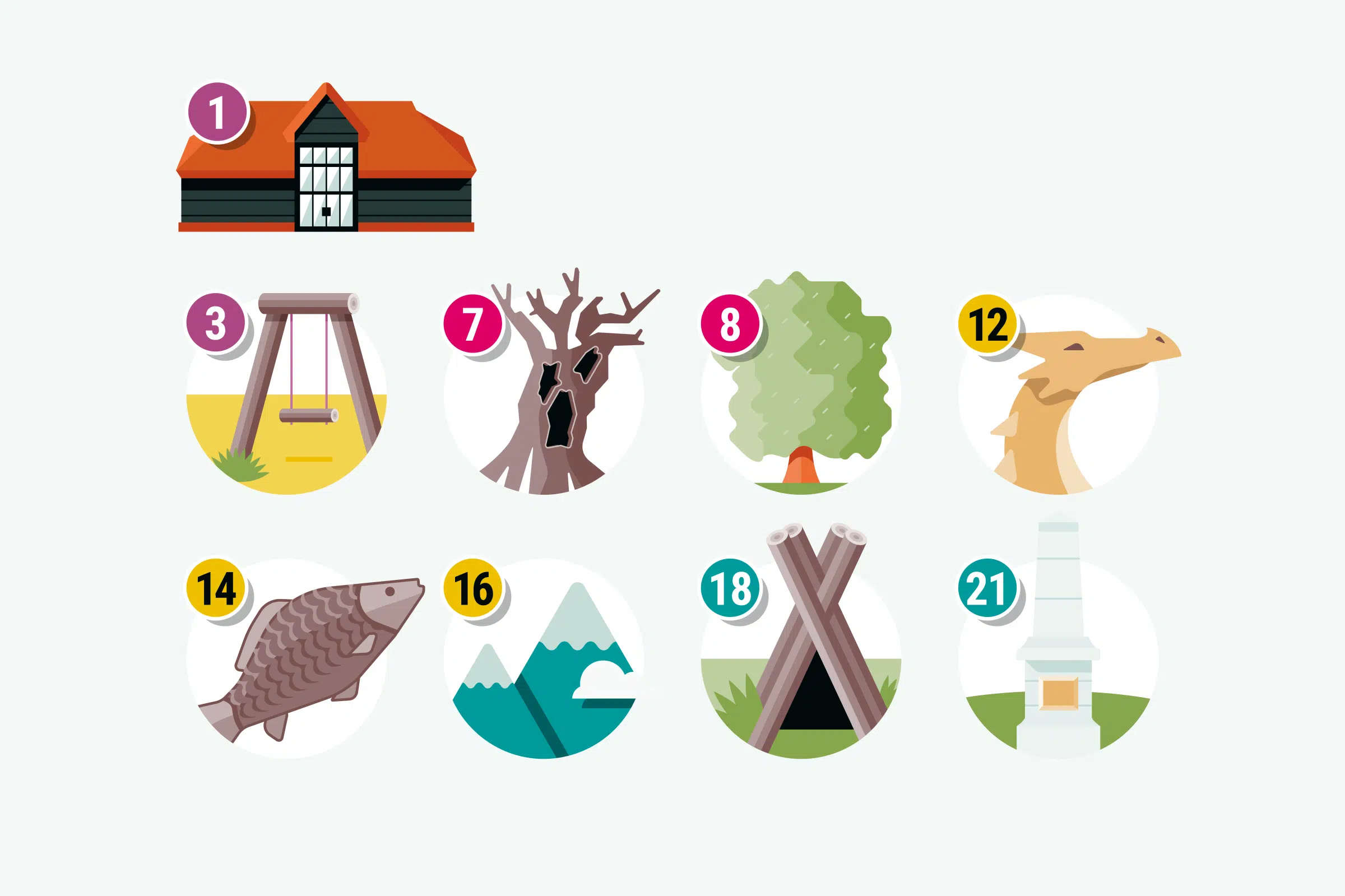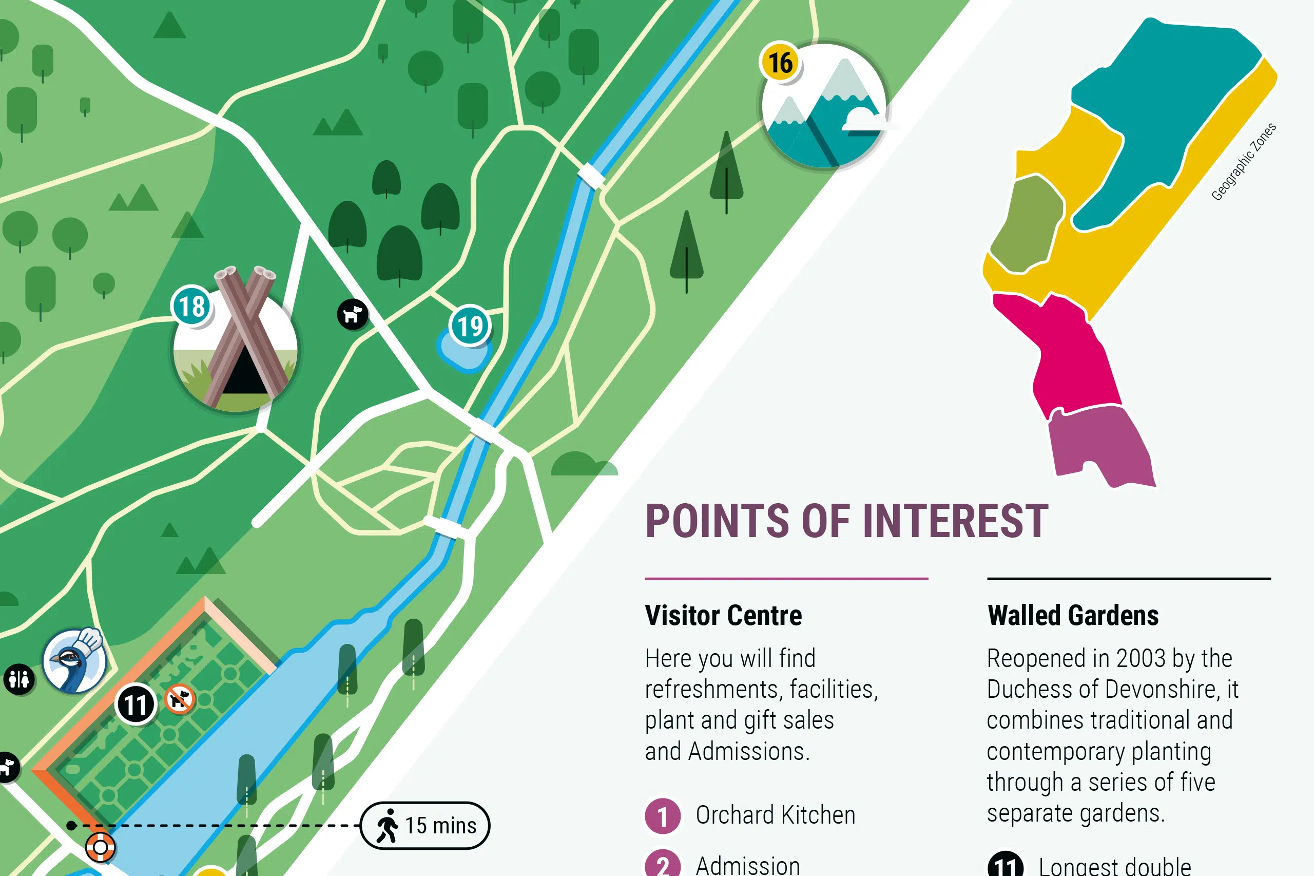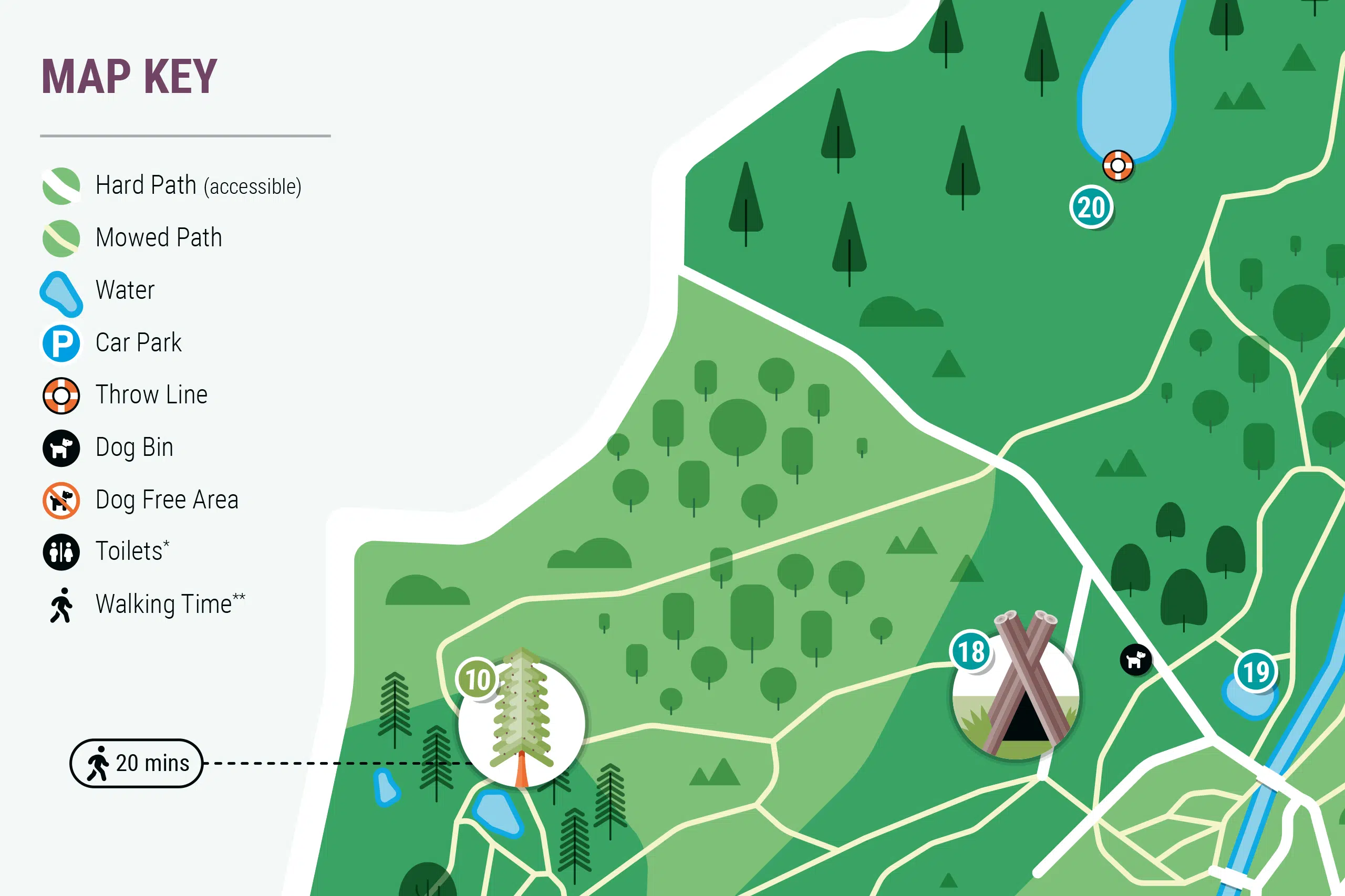As well as creating custom icons for the various types of trees, we also made some bespoke POI (point of interest) icons, based on an established style, and suggesting either a theme, object or animal related to a specific environment. The final map is printed on the back of a trifold leaflet, allowing visitors to easily take them around the estate.