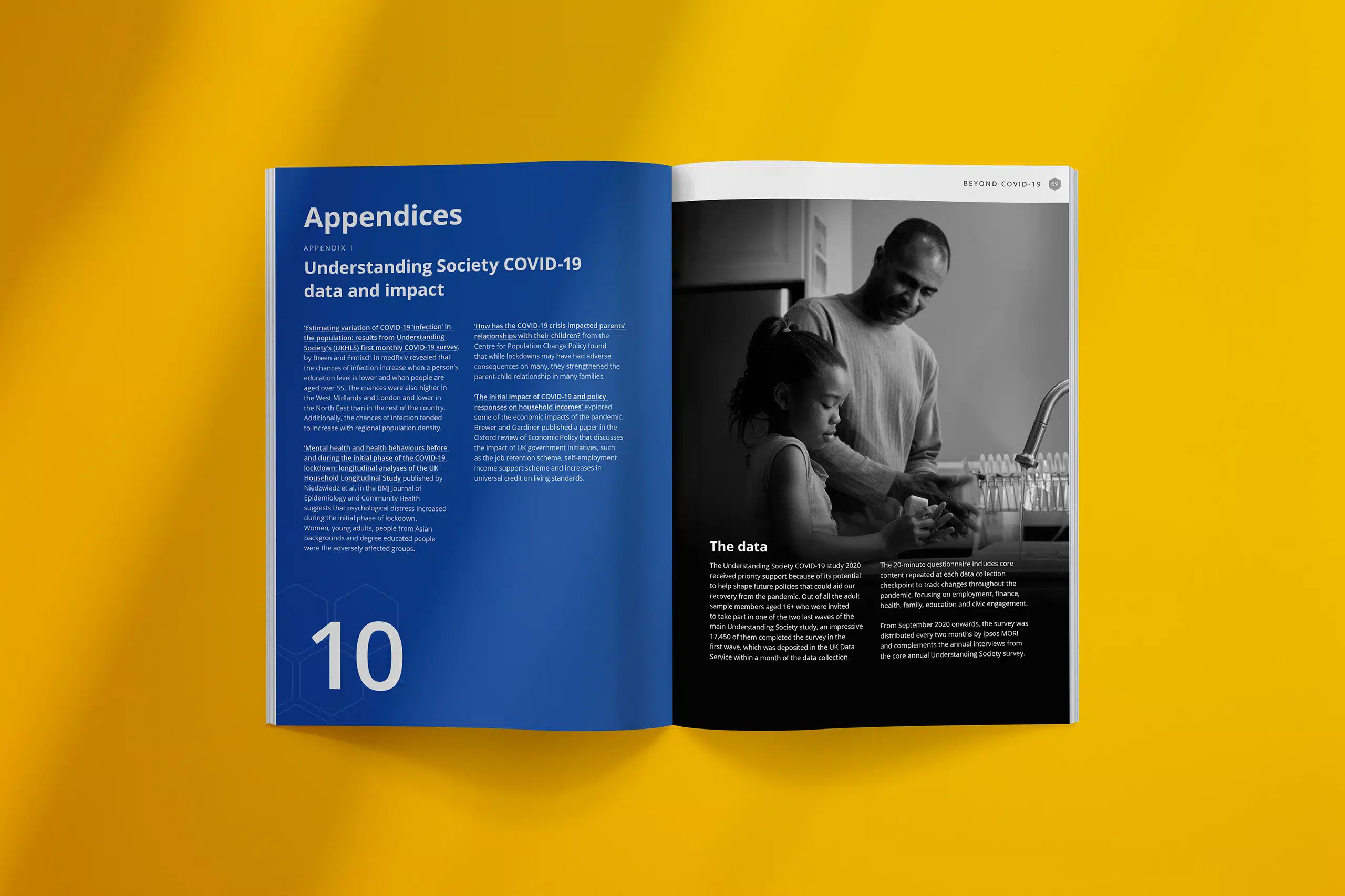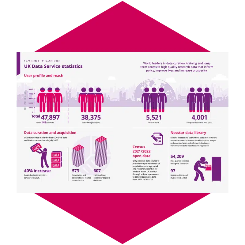 Titled ‘Beyond Covid-19’, the annual report covers the extraordinary two-year period between April 2020 and March 2022. Working with the UK Data Service (UKDS), we designed a report to highlight the exceptional work and impact UKDS made throughout the pandemic and demonstrate the significant rise in service use throughout that period.