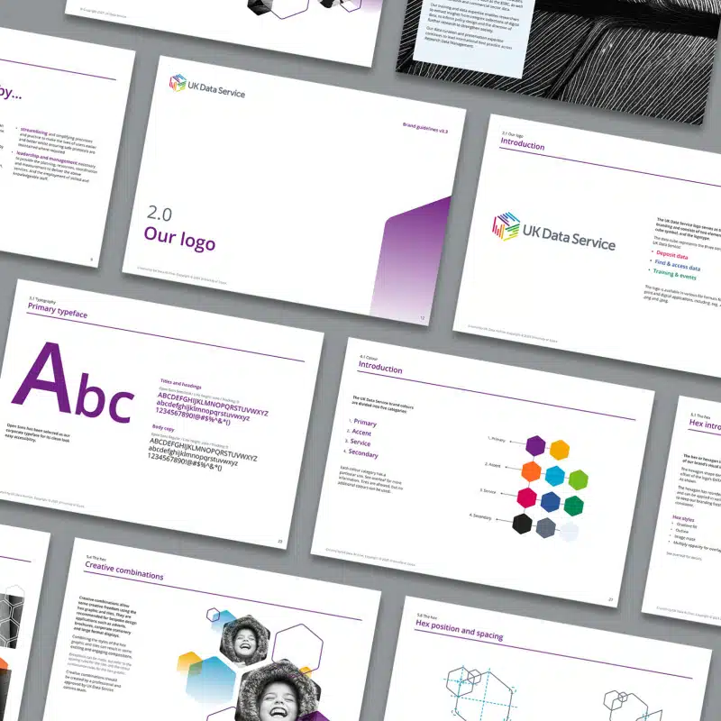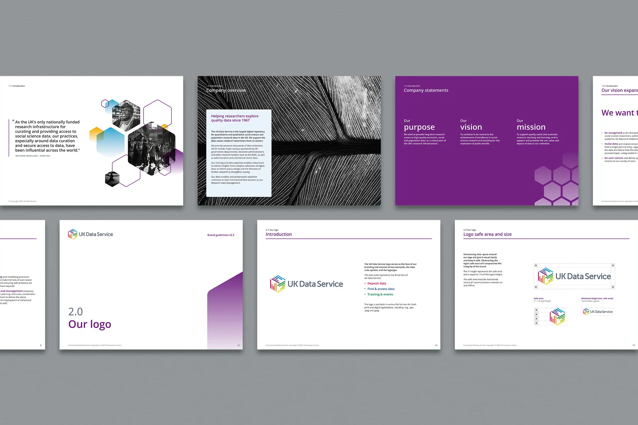 However, it’s not uncommon for brand guides to be very complex and to cover a host of different things. For UKDS, it was crucial that their brand could be conveniently applied to data visualisation and so the brand guide contained guidance and considerations for Microsoft Word documents and Excel spreadsheets to ensure that data was consistently presented across the organisation. Additionally, because UKDS frequently collaborate with other institutions, the brand guide laid out advice for logo placement for additional logos.