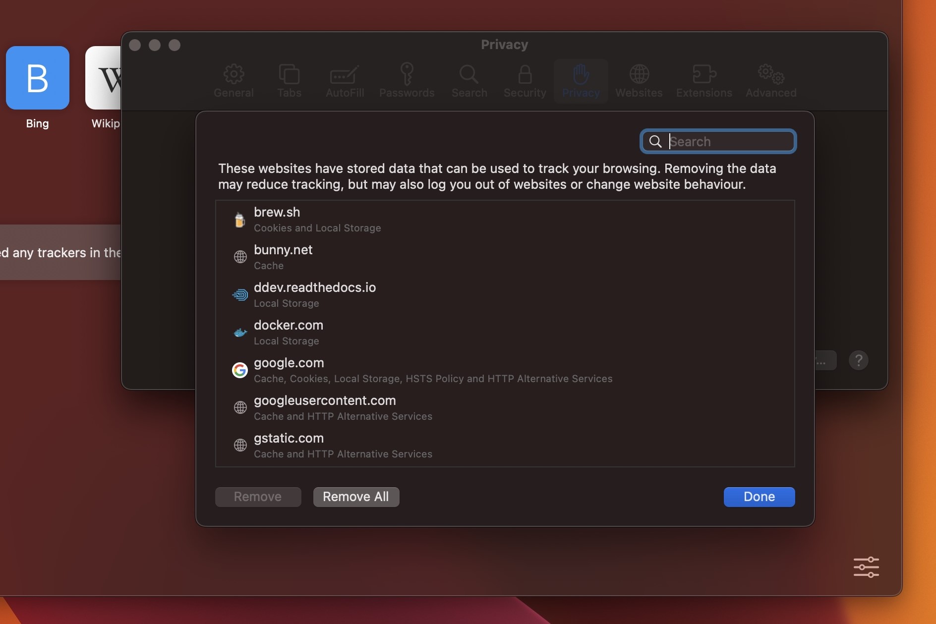 Select the Manage Website Data button, this will then show a list of all the sites Safari has collected data from.